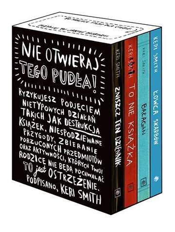 NIE OTWIERAJ TEGO PUDŁA! to nowy pakiet 4 bestsellerowych książek Keri Smith - "Zniszcz ten dziennik", "To nie książka", "Bałagan" oraz “Łowca Skarbów” w wersji DELUXE zaprojektowany przez samą Keri Smith. To limitowana edycja w wyjątkowym opakowaniu.